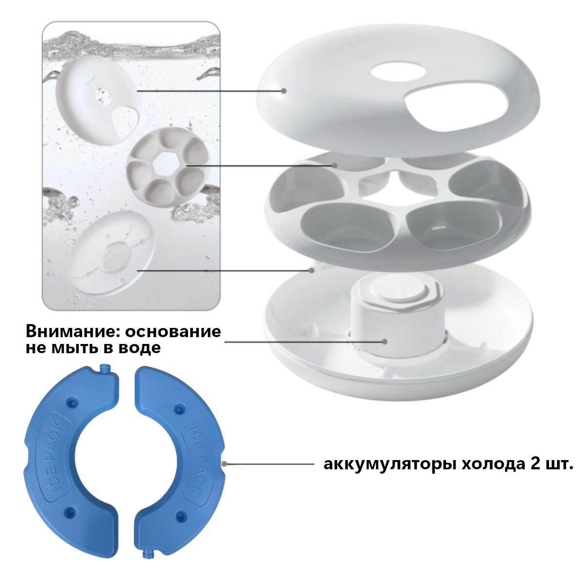 Комплектация: автоматическая кормушка, 2 аккумулятора холода, кабель питания с адаптером, инструкция.