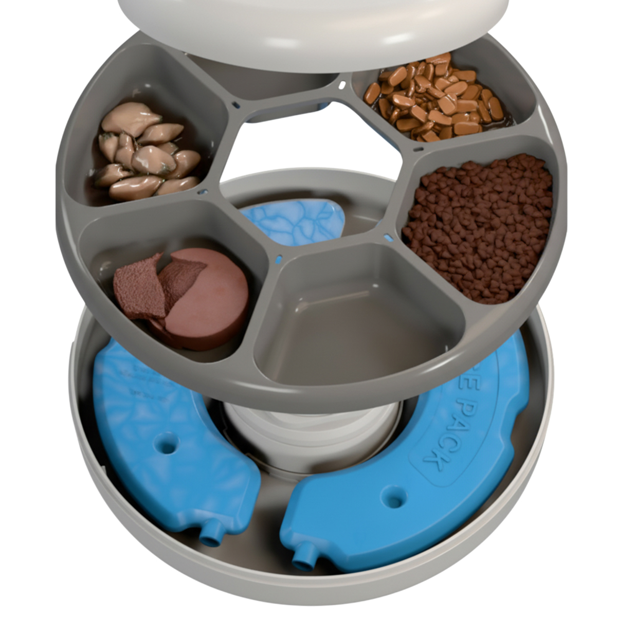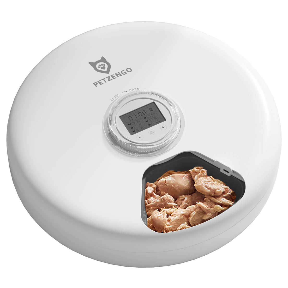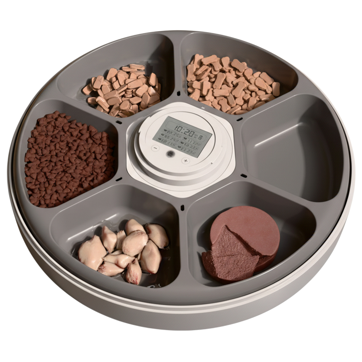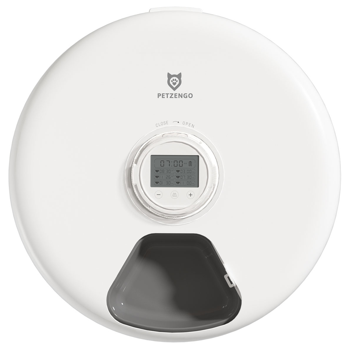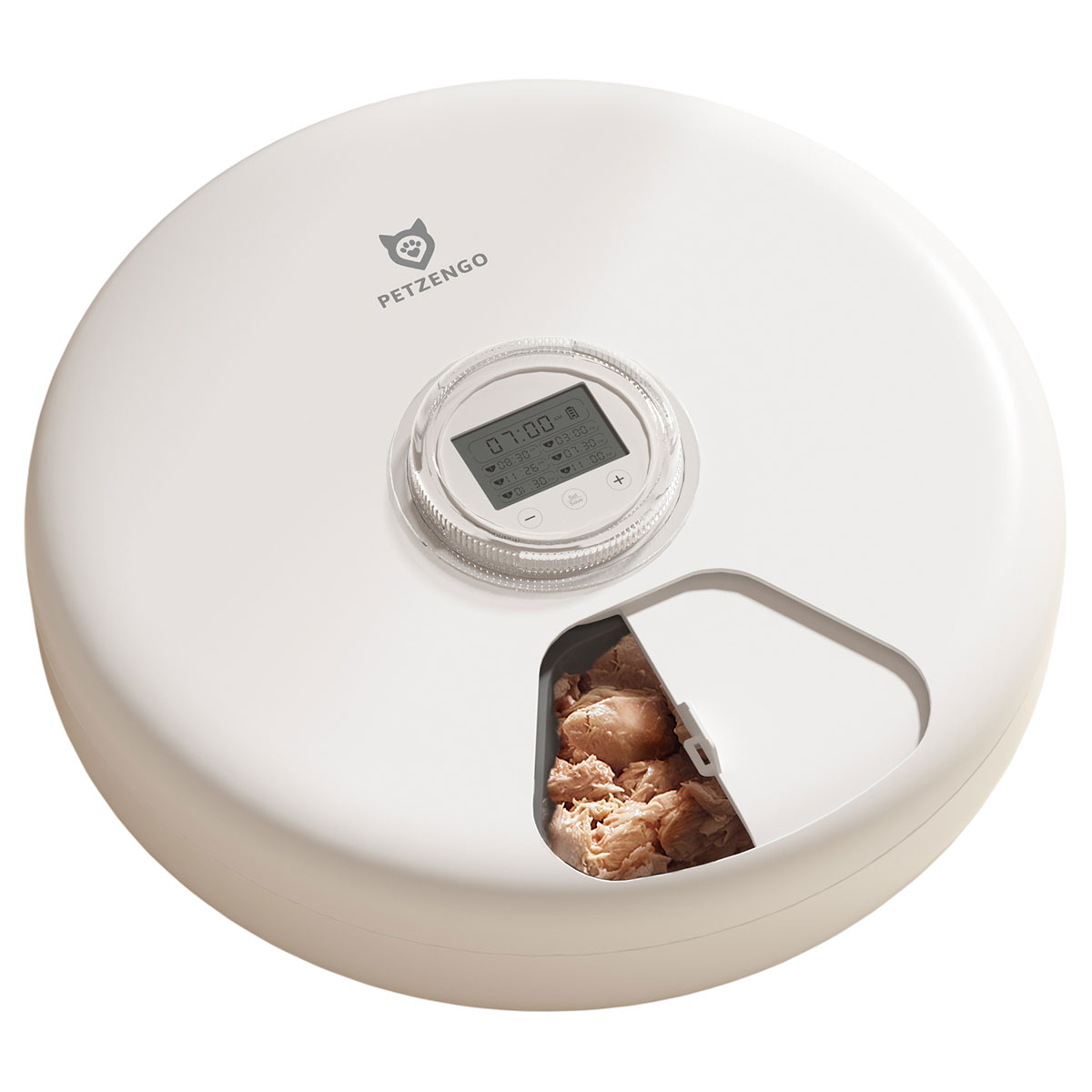 Petzengo PF19-L - умная автоматическая кормушка для сухих и влажных кормов на 6 кормлений, которая обеспечит кошек, маленьких и средних собак свежей едой в течение всего дня. Питание от 3 батареек АА. 6 секций по 200 мл. В отличиие от других подобных моделей, первая секция закрыта и первое кормление также произойдет по заданному вами времени.