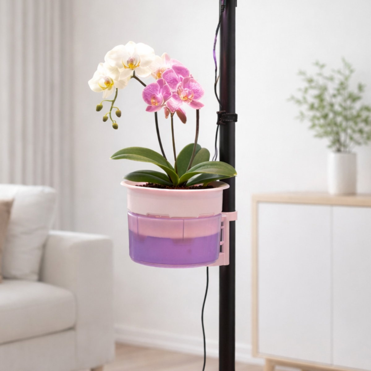 Кашпо с фитильным автополивом выдерживает до 5 кг и выполнено из пластика. Система автополива поддерживает стабильный уровень влаги, что снижает риск корневой гнили и пересыхания.