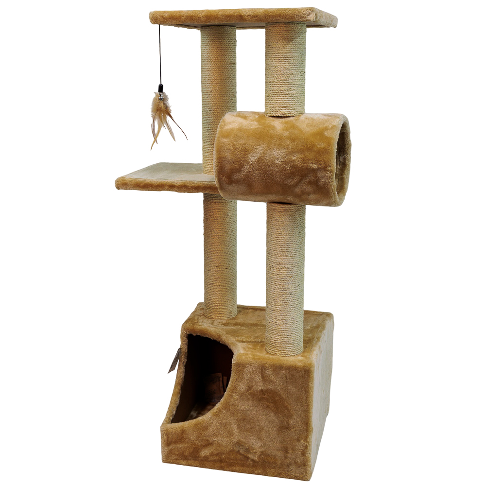 Игровой комплекс когтеточка для кошек в бежевом цвете станет отличным выбором для времяпрепровождения вашего питомца. Домик - удобное место для сна, где ваша кошка будет чувствовать себя защищенно. Две разноуровневые площадки и тоннель - это прекрасная возможность для кошки проявить свою ловкость и активность. Подвесная игрушка сделает жизнь кота интереснее.