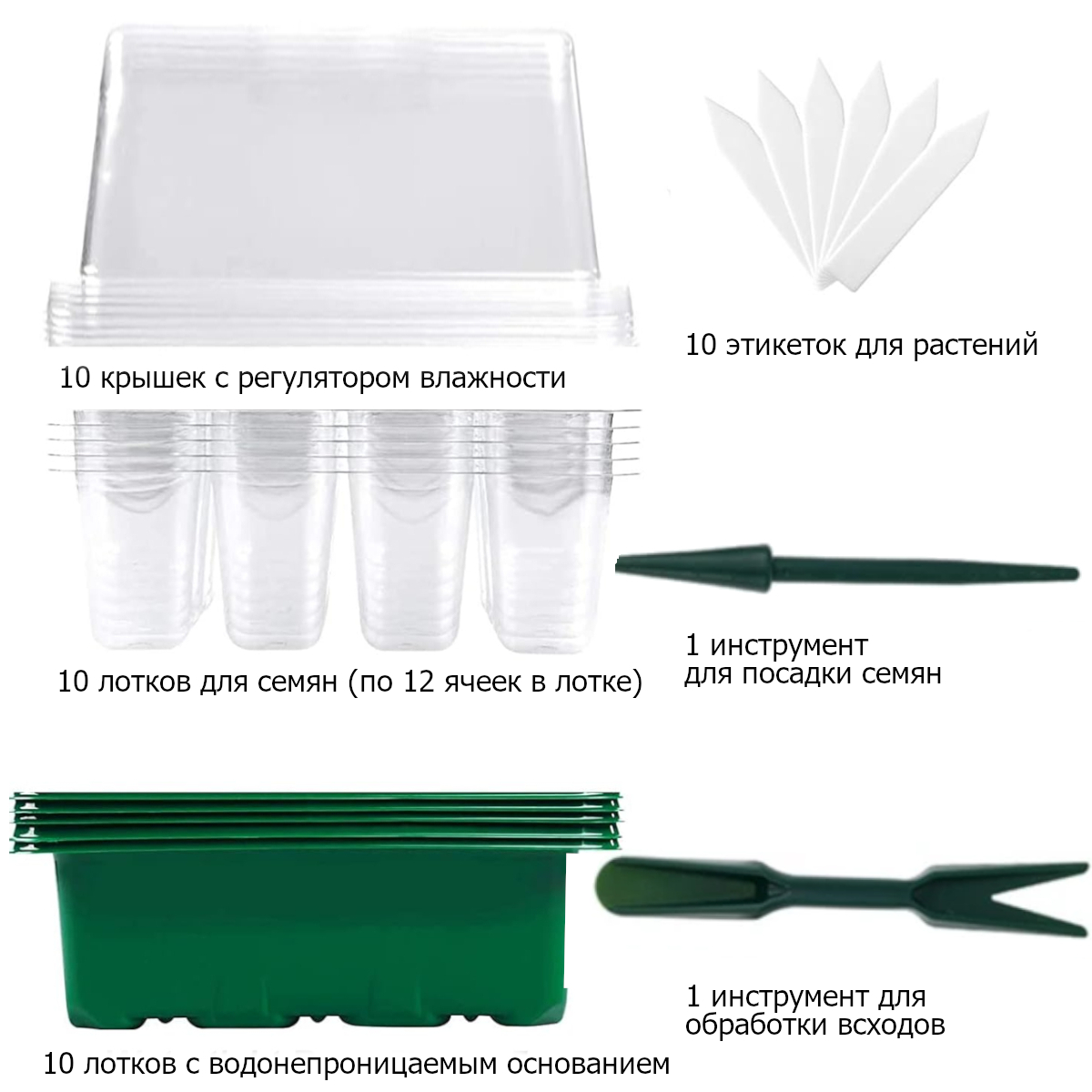 Состав набора: 10 мини парников; инструмент для посадки 2 шт.; таблички для надписей 10 шт.