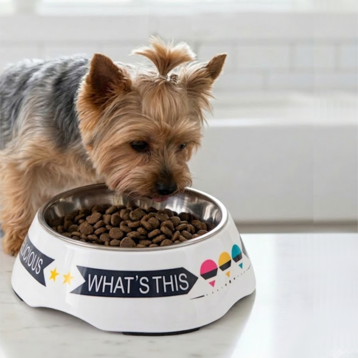 Меламиновая миска со вставкой из нержавеющей стали для собак и кошек, 11x16x4.8 см, 180 мл, рисунок Delicious. Блюдце из нержавеющей стали вынимается, что очень удобно при мытье миски. Подходит как для воды, так и для корма, специальные ножки с резиновыми накладками предупреждают скольжение. Миска устойчивая, благодаря расширяющемуся основанию.