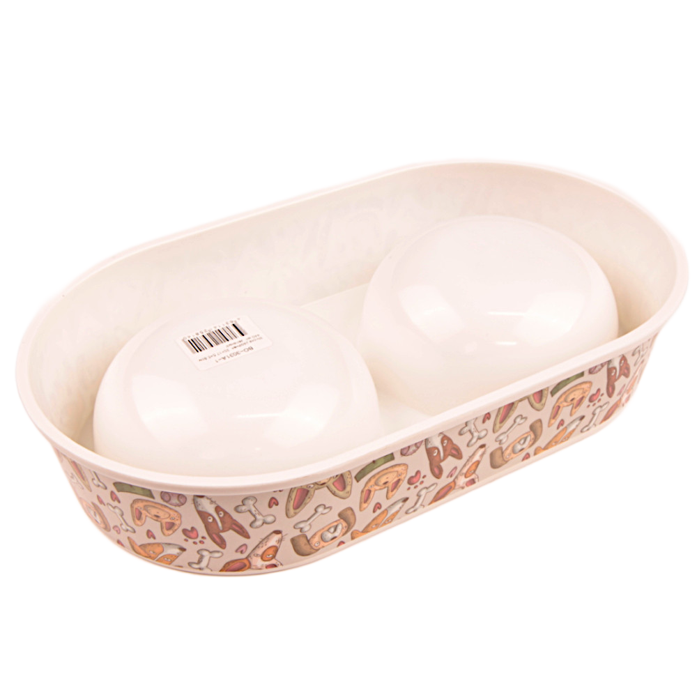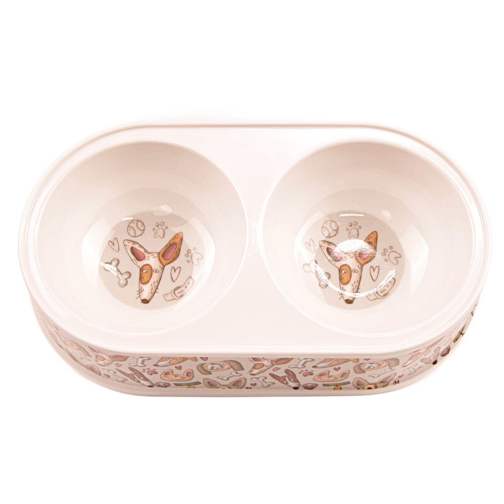Меламиновая двойная миска для собак и кошек, размер 30×17.5×5.8 см, 440+440 мл, цвет серый, предназначена для сухого/влажного корма и воды. Не впитывает запахи, не гнется, миска легко моется, имеет длительный срок эксплуатации. Красивый дизайн с ярким рисунком.