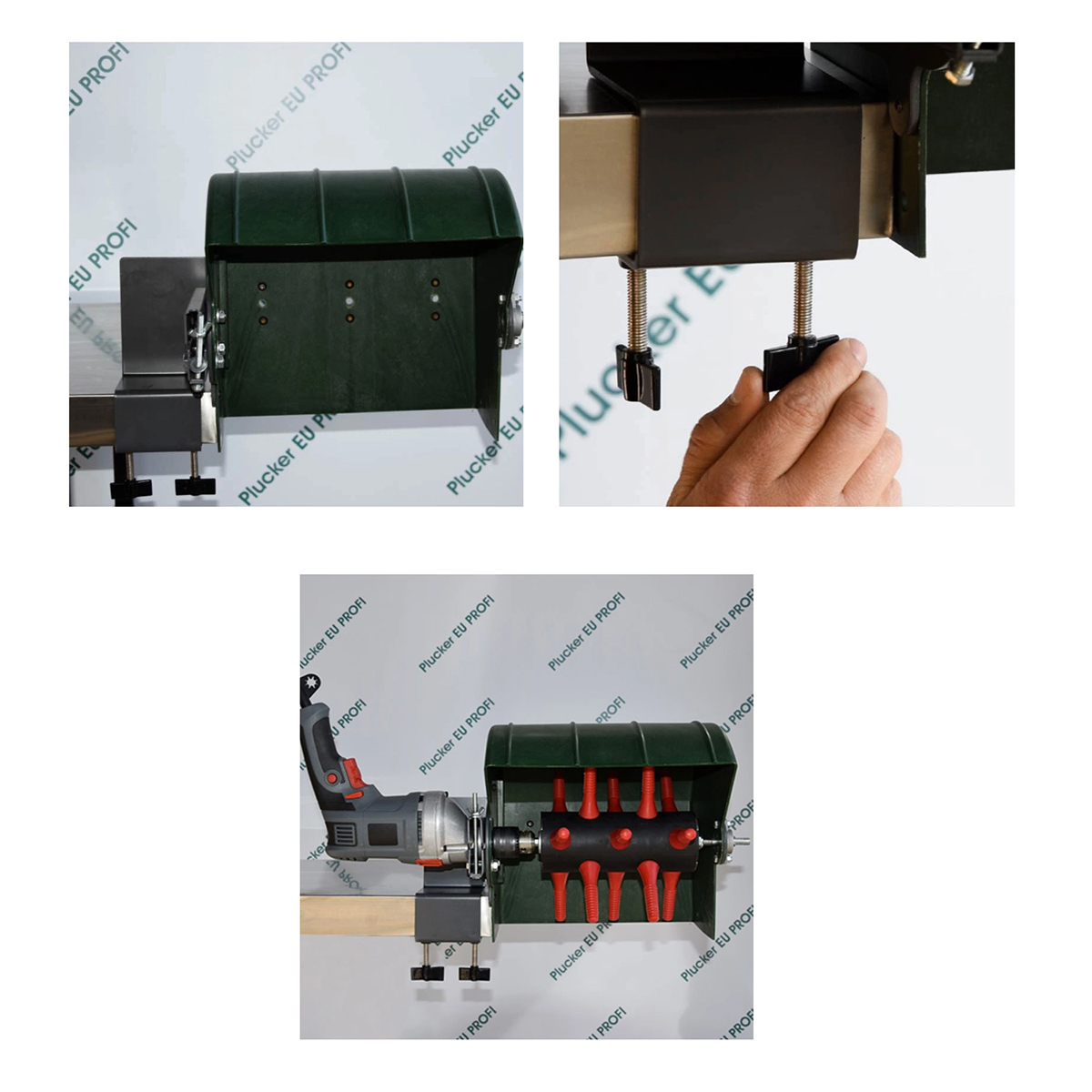 Эта модель поставляется с настольным зажимом для крепления защитного кожуха к столу. Насадка подходит для ощипывания цыплят бройлеров, кур, цесарок, петухов.
