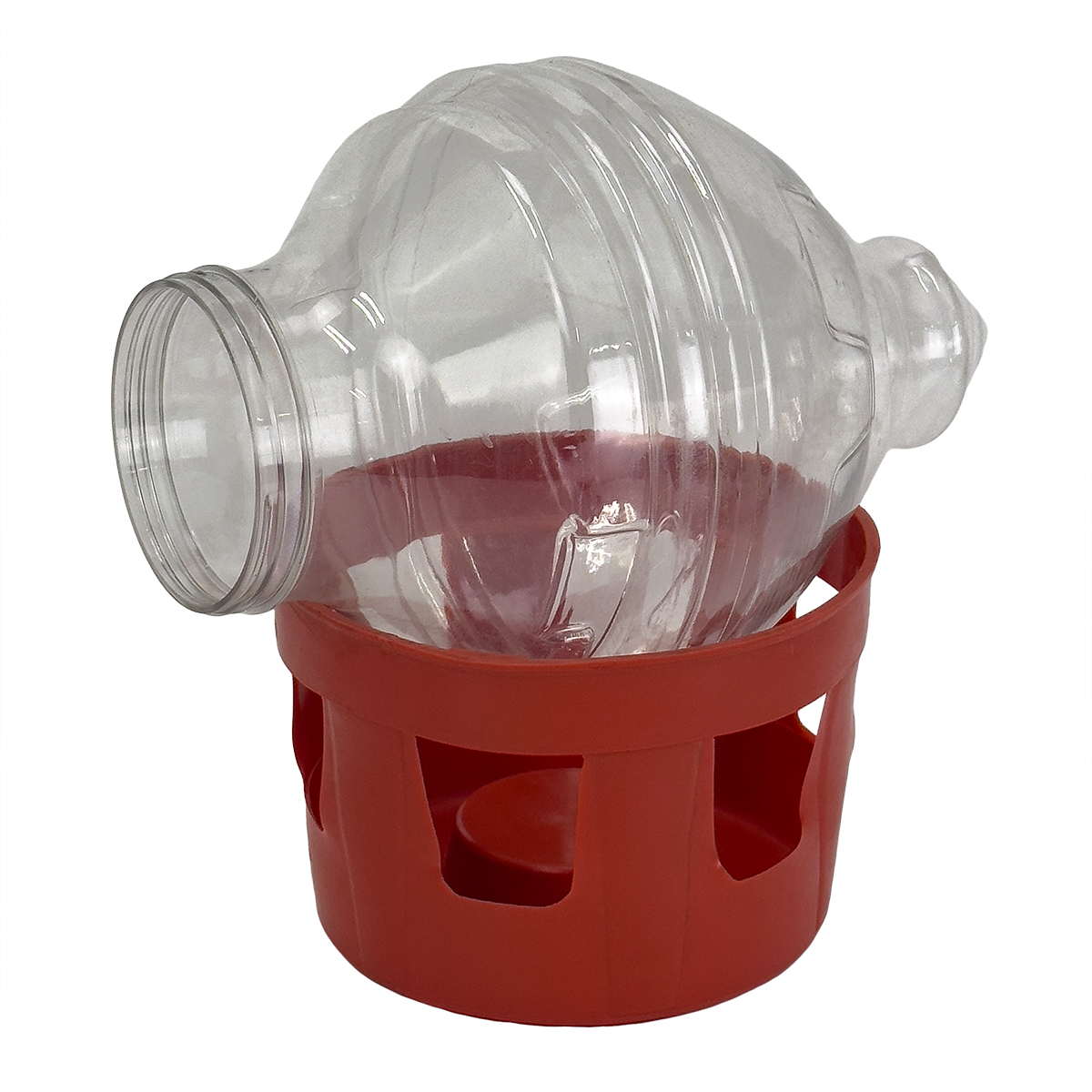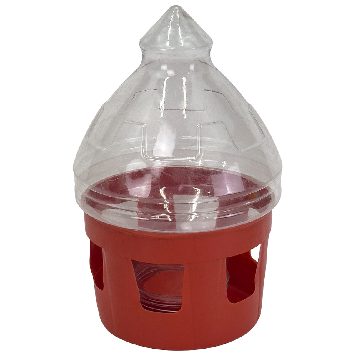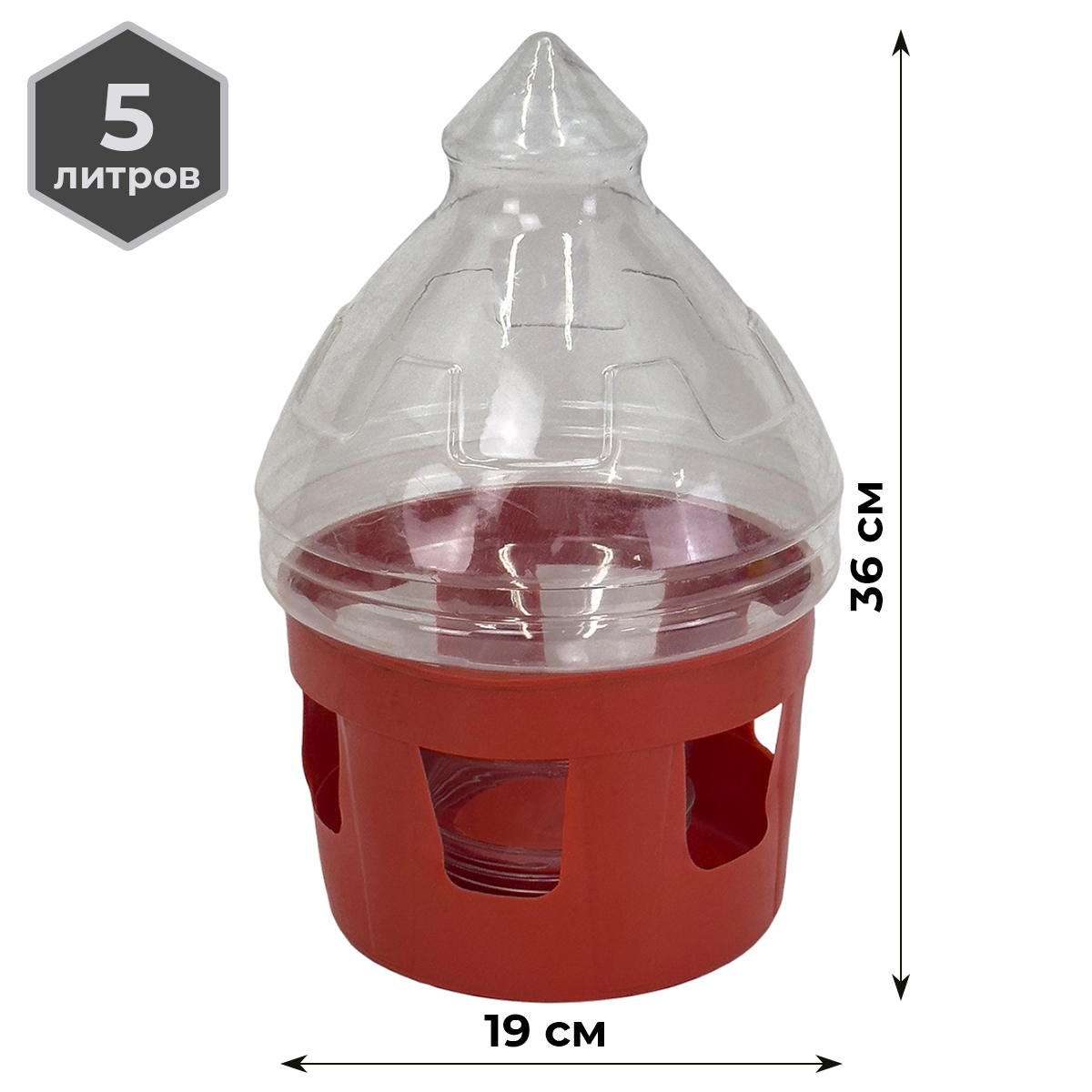 Красная вакуумная поилка для голубей объемом 5 л изготовлена из прочного пластика и состоит из двух частей, которые легко собираются.