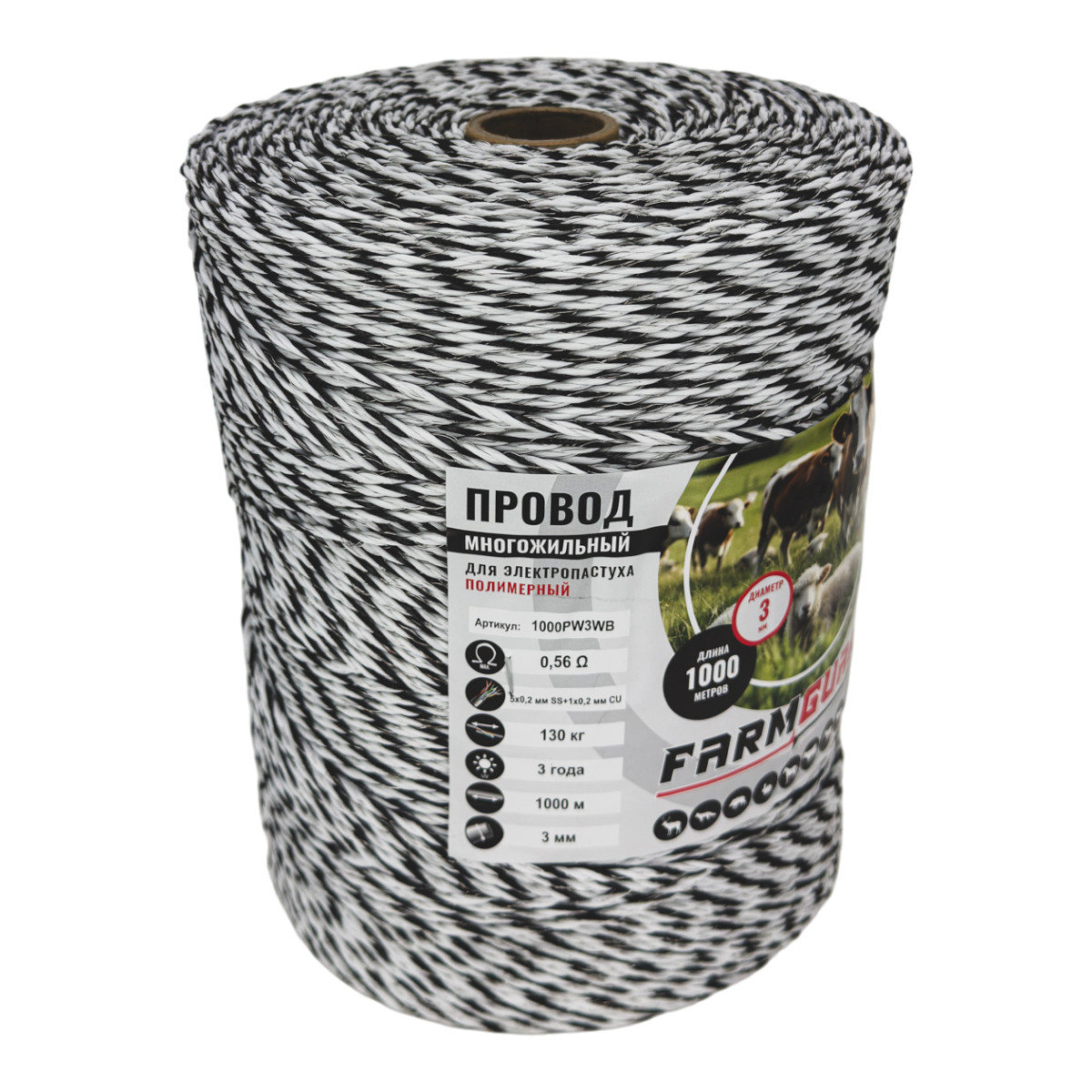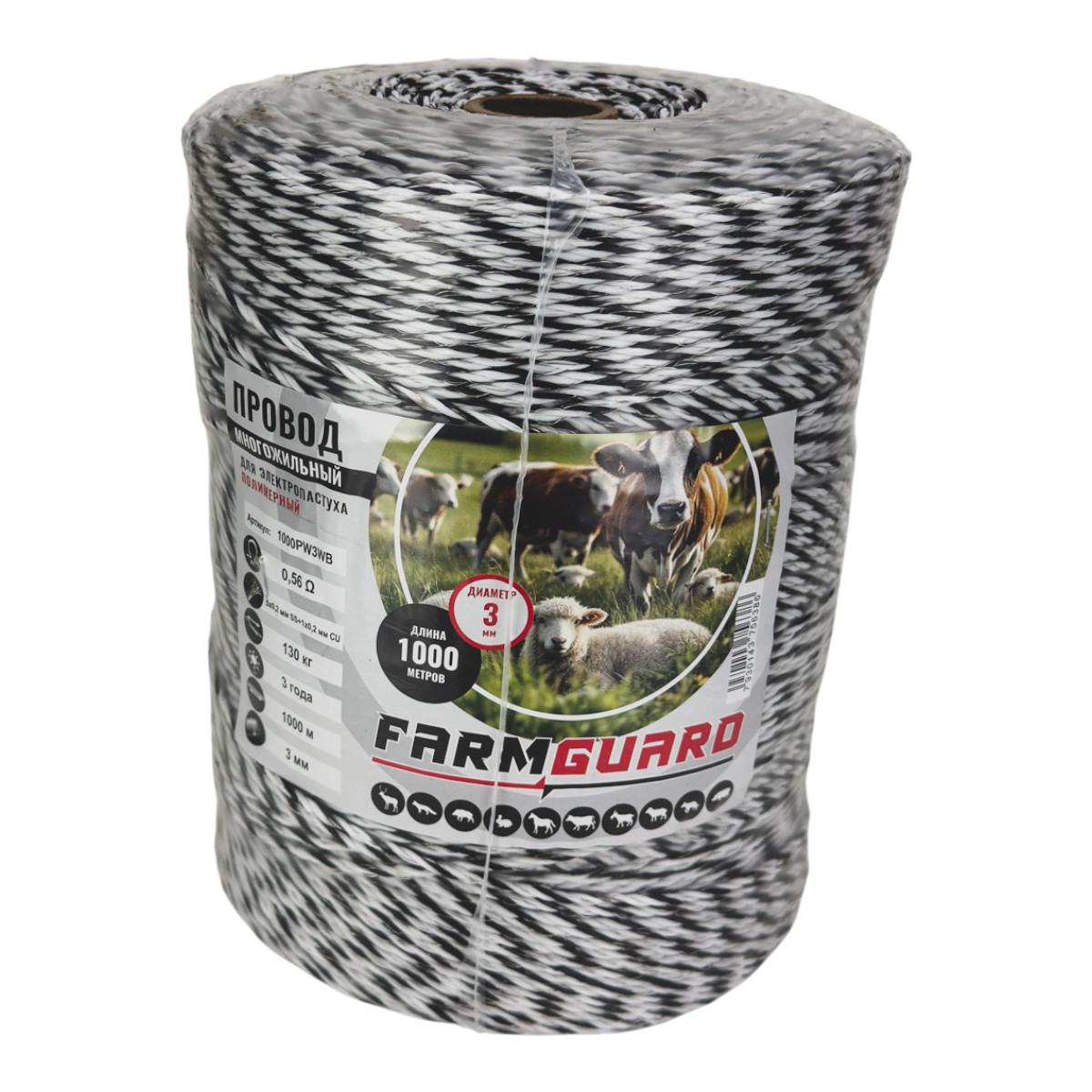 Полимерный провод для электропастуха диаметром 3 мм и длиной 1000 метров предназначен для организации высокоэффективных электрических ограждений на пастбищах, фермах и садовых участках. В состав шнура FarmGuard входят пять проводников из нержавеющей стали и один проводник из медной проволоки (все диаметром 0,2 мм), что обеспечивает отличное сочетание долговечности и высокой электропроводности.