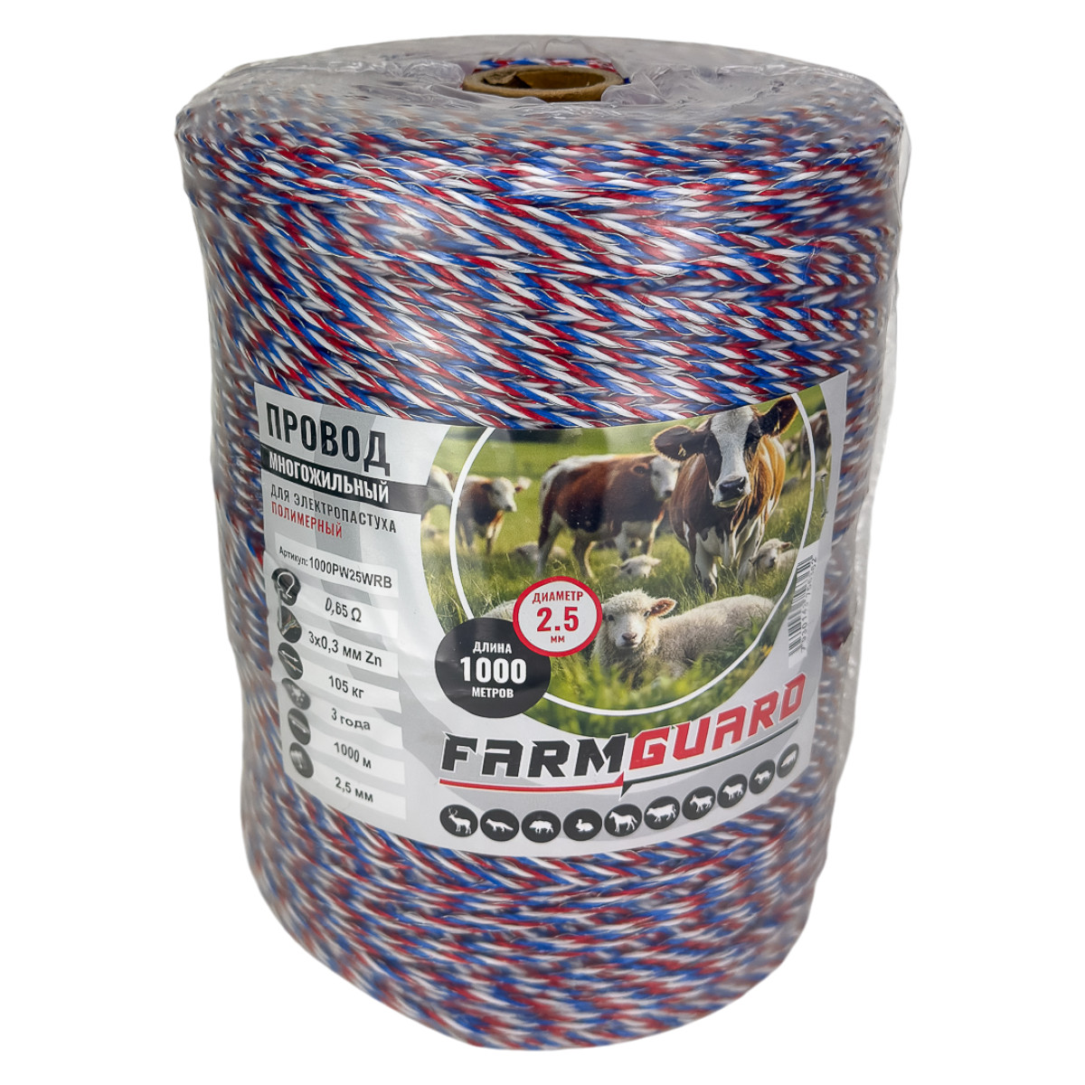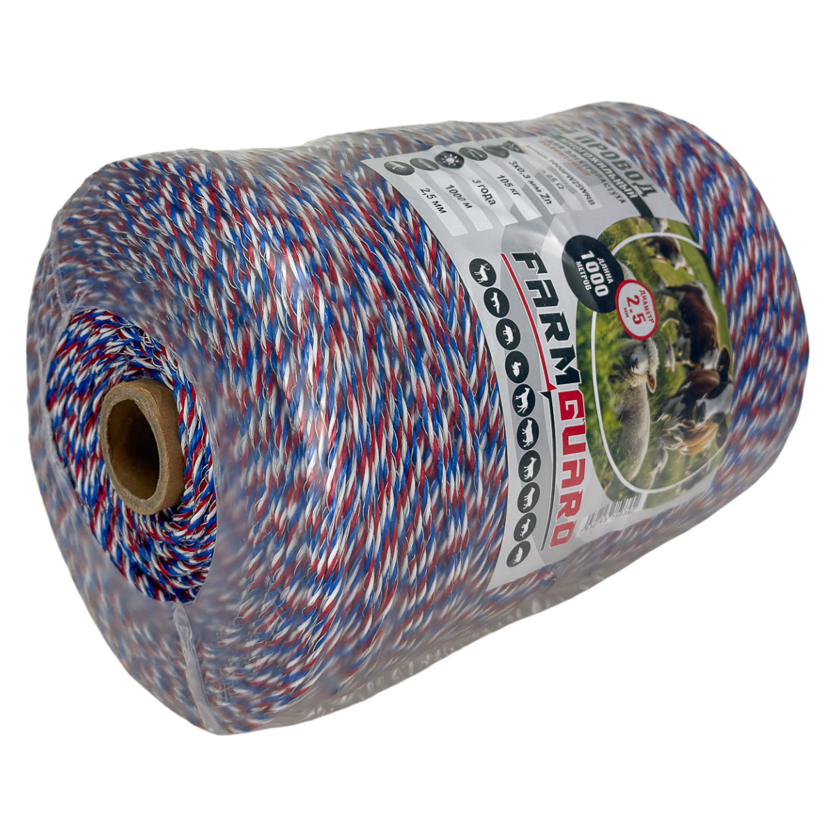 Полимерный провод для электропастуха диаметром 2,5 мм и длиной 1000 метров предназначен для создания надёжных электрических ограждений на пастбищах и фермерских хозяйствах. Шнур FarmGuard сплетён из прочного УФ-устойчивого полиэтилена, что обеспечивает долгий срок службы даже при постоянной эксплуатации на открытом воздухе. В конструкцию вплетены три проводника из оцинкованной стали диаметром 0,3 мм, которые обеспечивают необходимую проводимость электрического тока для эффективного воздействия на животных.