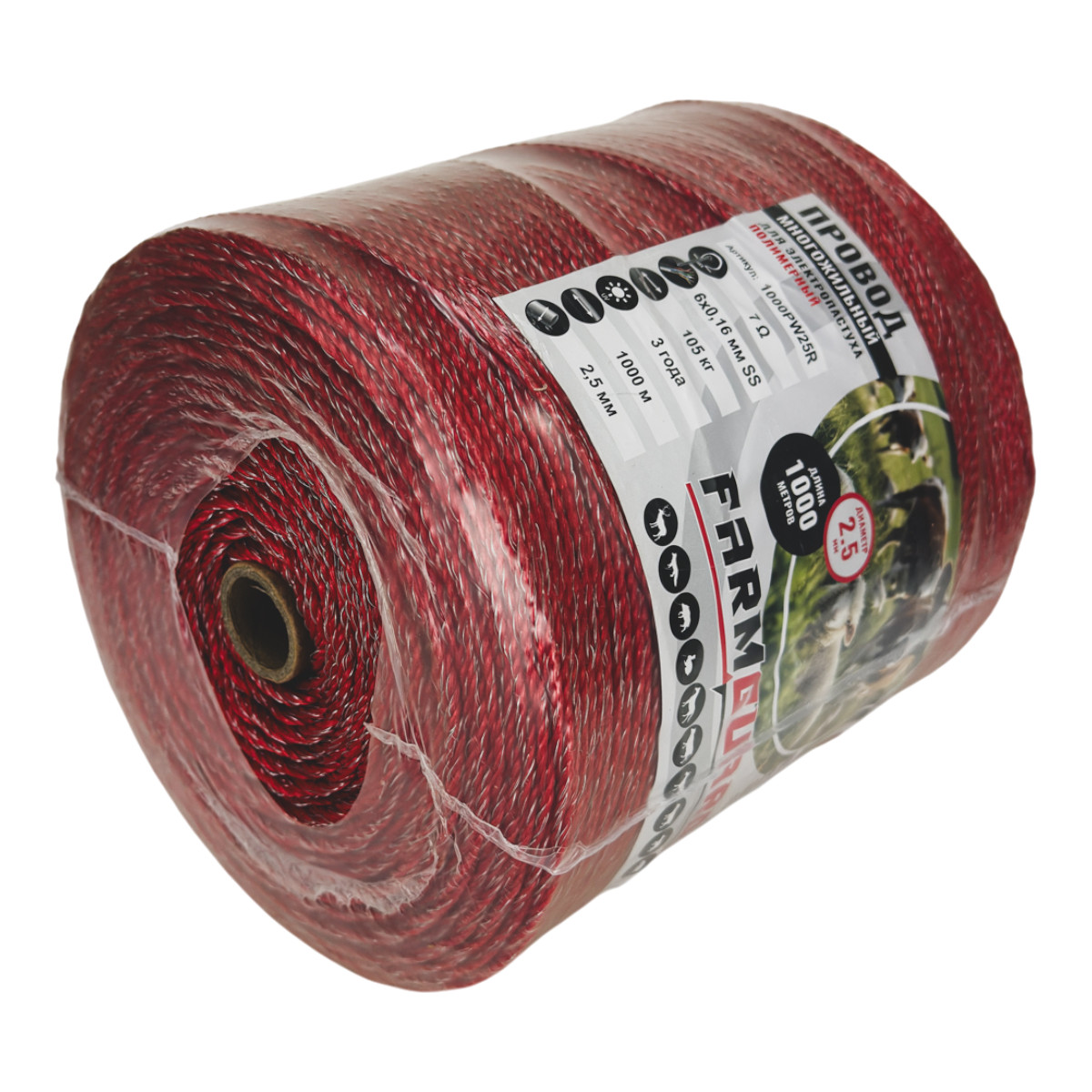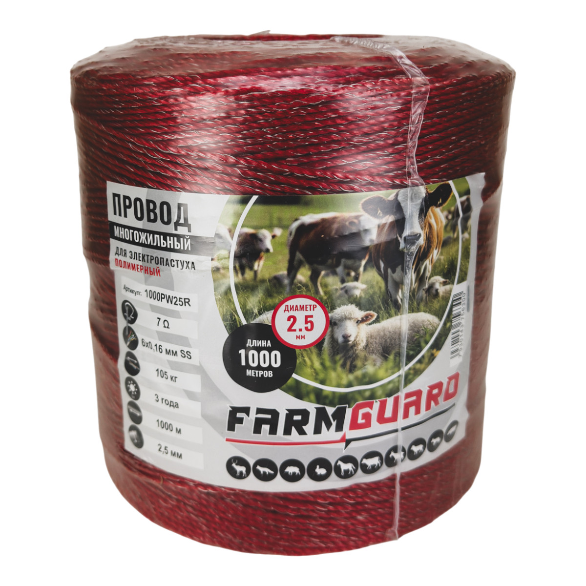 Полимерный провод для электропастуха диаметром 2,5 мм и длиной 1000 метров предназначен для создания надёжных электрических ограждений на пастбищах и фермерских хозяйствах. Шнур FarmGuard сплетён из прочного УФ-устойчивого полиэтилена, что обеспечивает долгий срок службы даже при постоянной эксплуатации на открытом воздухе. В конструкцию вплетены шесть проводников из нержавеющей стали диаметром 0,16 мм, которые обеспечивают необходимую проводимость электрического тока для эффективного воздействия на животных.