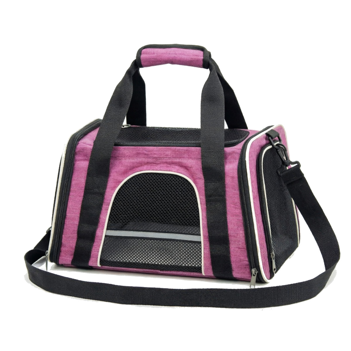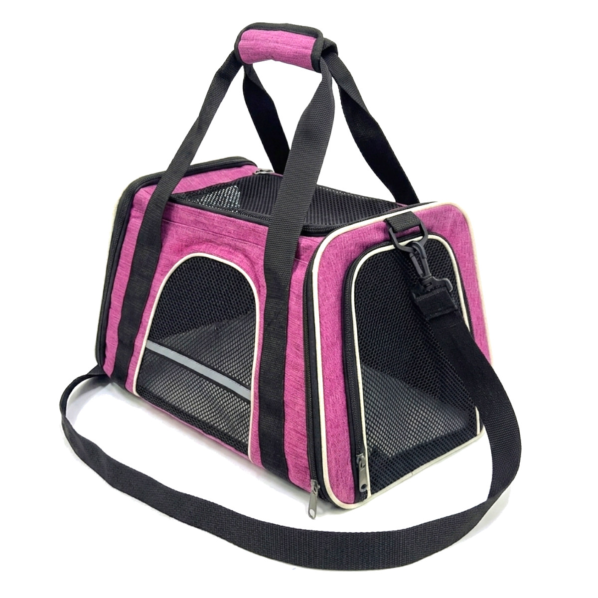 Складная сумка переноска для собак и кошек изготовлена из плотной синтетической ткани. Открывается с разных сторон и сверху.