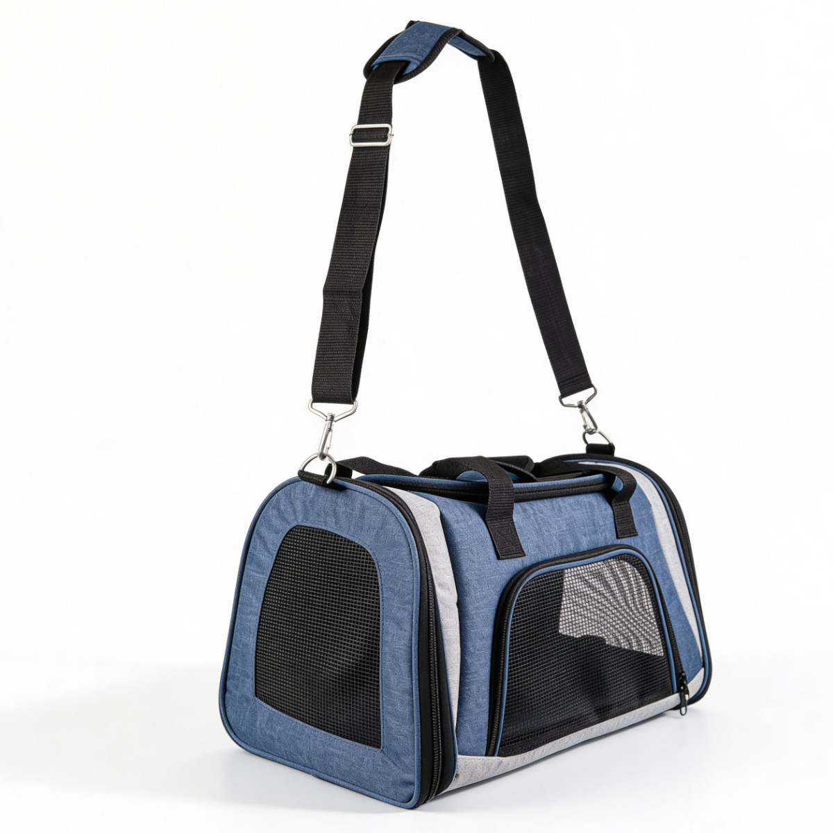 Переноска для животных изготовлена из высококачественного полиэстера, под джинсу, в синих и серых цветах. Материал устойчив к брызгам и легко чистится.